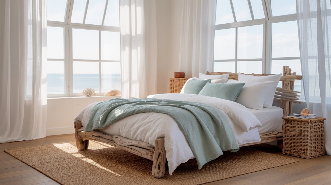 Coastal bedroom with driftwood nightstand, linen headboard, jute rug, and sheer curtains in soft sandy tones